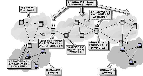 DiffServ區(qū)(region)則是由連續(xù)的DS區(qū)域構(gòu)成。一個DS區(qū)內(nèi)的DS區(qū)域可以支持不同的PHB組,并且各自區(qū)域的DSCP到PHB的映射函數(shù)也可能不相同。在不同的DS區(qū)域之間,必須對SLA和TCA進(jìn)行調(diào)節(jié),以協(xié)調(diào)彼此之間的服務(wù)語義。這樣,通過在上游DS區(qū)域和下游DS區(qū)域之間建立SLA或TCA,區(qū)分服務(wù)可以擴展到多個DS區(qū)域。