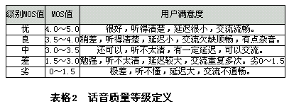 對于IP電話質(zhì)量的評價采用MOS(主觀平均評分)值評價,評測方法在ITU-TP.800中定義。實際中可以采用PESQ(語音質(zhì)量的知覺評估)客觀測試方法,在ITU-TP.862(PESQ)中定義。MOS值的定義如下表所示: