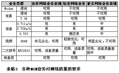 經(jīng)過試驗測試,對不同網(wǎng)絡(luò)質(zhì)量下的NGN業(yè)務(wù)表現(xiàn)總結(jié)如下表所示: