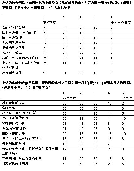 不久以前,“融合”這個(gè)詞給人的感覺(jué)是過(guò)分追捧技術(shù)和超前于時(shí)代的概念。此后不久,傳輸數(shù)據(jù)、語(yǔ)音和視頻的網(wǎng)絡(luò)融合逐漸成為現(xiàn)實(shí)。根據(jù)對(duì)103位高級(jí)經(jīng)理的調(diào)查結(jié)果表明,三分之二的企業(yè)正計(jì)劃在今后五年內(nèi)將其覆蓋整個(gè)企業(yè)的應(yīng)用轉(zhuǎn)型為統(tǒng)一的IP網(wǎng)絡(luò)。四分之一的調(diào)查反饋者認(rèn)為這對(duì)實(shí)現(xiàn)其企業(yè)戰(zhàn)略“尤為重要”。