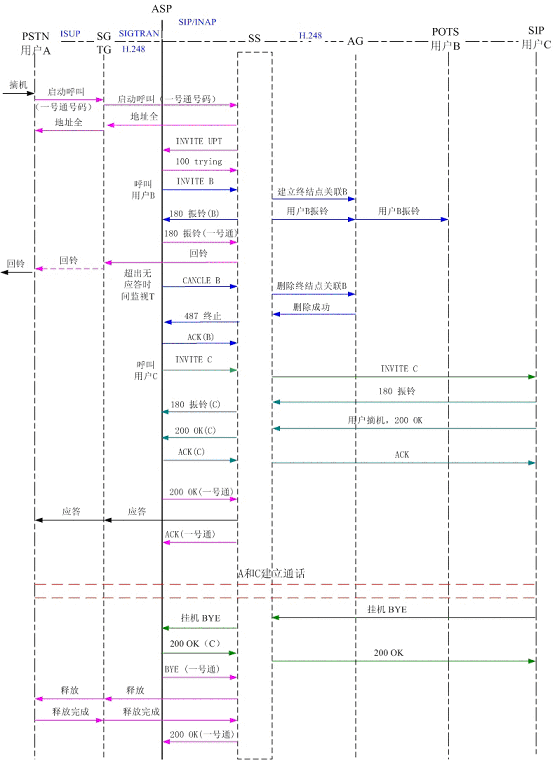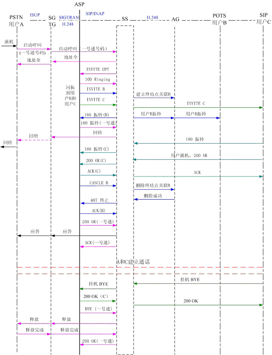 圖5為PSTN用戶A撥打一號通用戶,順呼軟交換域AG下POTS用戶B和SIP用戶C,其中軟交換和應(yīng)用服務(wù)器以SIP協(xié)議相連,軟交換和AG、軟交換和TG以H.248協(xié)議相連。可以看到,用戶B首先振鈴,振鈴達(dá)到規(guī)定時(shí)間后,應(yīng)用服務(wù)器取消了對用戶B的振鈴,轉(zhuǎn)而對用戶C振鈴。用戶C摘機(jī)應(yīng)答,通話結(jié)束,用戶C掛機(jī),系統(tǒng)釋放了呼叫。