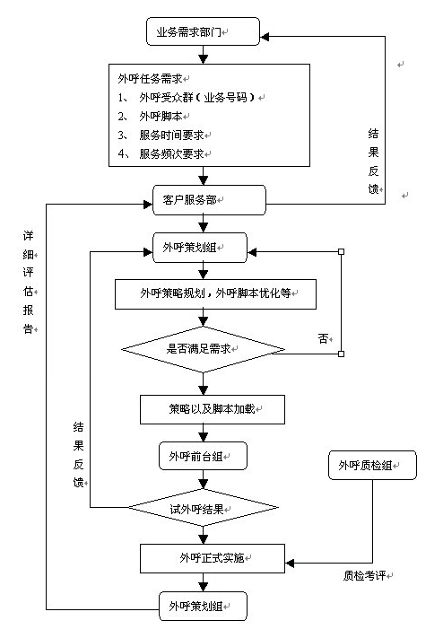 。。外呼業(yè)務(wù)數(shù)據(jù)(外呼業(yè)務(wù)需求書)由需求部門提出,以業(yè)務(wù)聯(lián)系單的形式,發(fā)往客戶服務(wù)部。外呼業(yè)務(wù)需求書應(yīng)包括需要進(jìn)行外呼的目標(biāo)用戶,包括明確的外呼業(yè)務(wù)腳本,應(yīng)給出明確的完成時(shí)間要求,以及外呼時(shí)點(diǎn)(如:是白天、夜晚、節(jié)假日等),如果外呼不成功,需重復(fù)的頻次等。