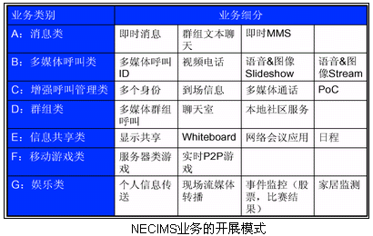 NEC的IMS系統(tǒng)已經(jīng)可以在SIP終端上實現(xiàn)這些業(yè)務(wù):PoC(手機一鍵通)、聊天、在線游戲、IM(即時消息)、Presence、多媒體呼叫、流媒體應(yīng)用和視頻消息等業(yè)務(wù)。