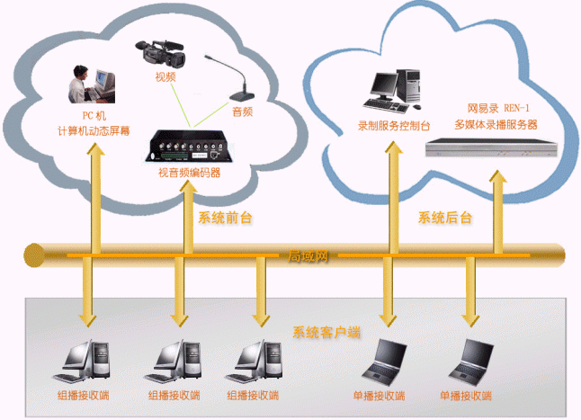 - 系統(tǒng)后臺:連接在網(wǎng)絡(luò)上即可,接受REN-1服務(wù)器管理端發(fā)送來的系統(tǒng)管理、維護(hù)指令,并負(fù)責(zé)將系統(tǒng)前臺發(fā)送來的視頻、音頻、計算機(jī)動態(tài)屏幕進(jìn)行實(shí)時錄制和直播,它包括:網(wǎng)易錄媒體中心(REN-1),它為系統(tǒng)的核心,主要完成視頻、音頻、計算機(jī)動態(tài)屏幕的錄制和直播;
