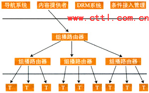 IPTV業(yè)務(wù)提供者可以根據(jù)用戶的請求,利用IP網(wǎng)絡(luò)本身所提供的組播能力將視頻信息以組播的方式傳送給用戶。此時,同時向相同的業(yè)務(wù)提供者請求發(fā)送相同內(nèi)容信息的用戶,可以由業(yè)務(wù)提供者安排在同一個組播組中接收到相同的信息。為給內(nèi)容提供者提供知識產(chǎn)權(quán)保護,業(yè)務(wù)提供者提供條件接入控制。同時為減少骨干網(wǎng)絡(luò)傳輸?shù)膲毫Γ瑯I(yè)務(wù)提供者在向眾多的用戶提供組播式業(yè)務(wù)時可以利用多級組播的形式來實現(xiàn)。組播式IPTV業(yè)務(wù)可能的系統(tǒng)模型示意如圖1所示。