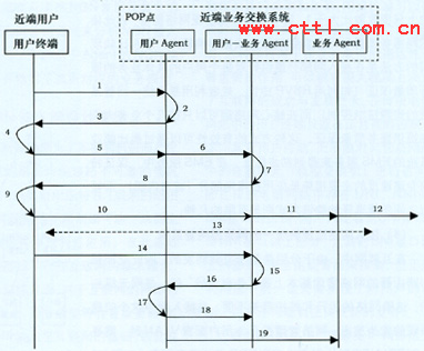 在POP點(diǎn)處,每類業(yè)務(wù)有一個(gè)“業(yè)務(wù)Agent”,其生命周期與運(yùn)營(yíng)商此類業(yè)務(wù)的生命周期相同,即從運(yùn)營(yíng)商開通此類業(yè)務(wù)到運(yùn)營(yíng)商終止提供此類業(yè)務(wù)為止,因此“業(yè)務(wù)Agent”基本上是長(zhǎng)期存在的!皹I(yè)務(wù)Agent”負(fù)責(zé)對(duì)不同用戶的同類業(yè)務(wù)進(jìn)行匯聚,統(tǒng)一與遠(yuǎn)端的“業(yè)務(wù)Agent”進(jìn)行業(yè)務(wù)交互。