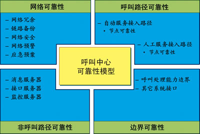 根據(jù)多年的實(shí)踐經(jīng)驗(yàn),對電信級呼叫中心提出如下高可靠性分析模型,如圖1所示。該模型將電信級呼叫中心可靠性分析分為四個(gè)維度:網(wǎng)絡(luò)可靠性、呼叫路徑可靠性、邊界可靠性、非呼叫路徑可靠性。