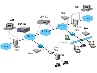 以上兩種測試方法也可以結(jié)合使用,在進(jìn)行端到端VQT測試時(shí),在NGN網(wǎng)絡(luò)的中間網(wǎng)段(根據(jù)需要可以設(shè)置多個(gè)監(jiān)測點(diǎn))部署分布式網(wǎng)絡(luò)分析儀(DNA),進(jìn)行被動式RTP/RTCP監(jiān)測,從而判斷出造成語音質(zhì)量下降的環(huán)節(jié)所在。如下圖所示: