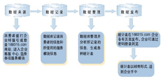 "企業(yè)客戶服務(wù)系統(tǒng)"統(tǒng)計(jì)數(shù)據(jù)分析功能,能幫助企業(yè)管理人員適時監(jiān)控"企業(yè)客戶服務(wù)系統(tǒng)"的運(yùn)行情況,自動采集消費(fèi)者在使用"企業(yè)客戶服務(wù)系統(tǒng)"過程的相關(guān)數(shù)據(jù),并分類整理成數(shù)據(jù)庫,為企業(yè)經(jīng)理人投資決策提供重要的數(shù)據(jù)支持。企業(yè)經(jīng)理人只需登陸客戶服務(wù)網(wǎng)站www.168315.com,按照"168315客戶服務(wù)中心"提供的用戶名和密碼登錄,即可隨時下載"企業(yè)客戶服務(wù)系統(tǒng)"的運(yùn)行數(shù)據(jù),瀏覽客戶檔案庫。也可以由"中心"的服務(wù)人員將統(tǒng)計(jì)結(jié)果通過E-mail、傳真或郵寄的方式送到企業(yè)經(jīng)理人手中,如下圖: