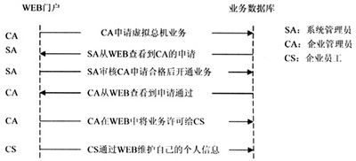 虛擬總機系統(tǒng)開戶流程采用WEB方式實現(xiàn),以此完成用戶對虛擬總機業(yè)務的定購、系統(tǒng)管理員對用戶開戶申請的審核、用戶業(yè)務參數(shù)的控制等操作,最后企業(yè)員工可以在企業(yè)管理員許可業(yè)務后,登陸WEB門戶管理個人信息。具體流程如圖2所示。