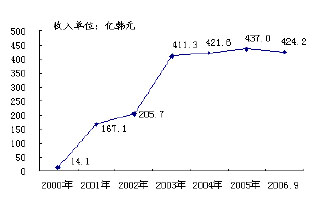 經(jīng)過(guò)6年多的運(yùn)營(yíng),韓國(guó)電信的eBilling業(yè)務(wù)發(fā)展良好,目前與其合作的ICP已達(dá)到500多家,內(nèi)容涵蓋了收費(fèi)郵箱、在線軟件銷(xiāo)售、聊天、娛樂(lè)、游戲、漫畫(huà)、綜合信息等;業(yè)務(wù)收入也逐年上升,從2000年的14.1億韓元(折合人民幣0.11億元)增長(zhǎng)到2006年9月份的424.2億韓元(折合人民幣3.3億元),如圖2、圖3所示。