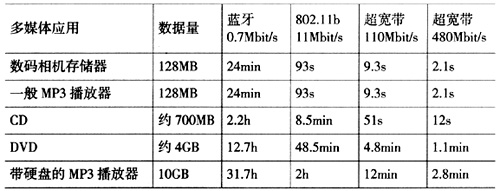 2.0接口相當(dāng),遠遠高于無線局域網(wǎng)802.11b的11 Mbit/s,也比下一代無線局域網(wǎng)802.11a/g的54 Mbit/s高出近一個數(shù)量級。UWB通信的功耗較低,能更好地滿足使用電池的移動設(shè)備的要求。另外,UWB信號的功率譜密度非常低,信號難以被檢測到,再加上采用的跳頻、直接序列擴頻等擴頻多址技術(shù),使非授權(quán)者很難截獲傳輸?shù)男畔,因而安全性非常好。?是一些典型的實時多媒體應(yīng)用對不同無線傳輸技術(shù)的數(shù)據(jù)傳輸速率的要求。從表中可以看出,如果采用無線的方式來進行傳輸,只有UWB技術(shù)可以滿足各種應(yīng)用的要求。