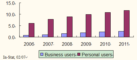 In-Stat預(yù)計(jì),到2011年中國手機(jī)電子郵件用戶達(dá)到1400萬戶,其中企業(yè)用戶達(dá)到250萬,個(gè)人用戶達(dá)到1170萬。2007到2011年,企業(yè)用戶年均復(fù)合增長(zhǎng)率為24.8%,個(gè)人用戶年均復(fù)合增長(zhǎng)率為10.6%。如下圖所示:
