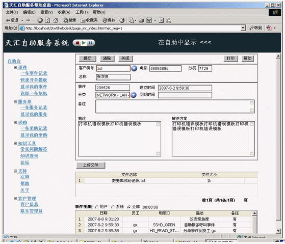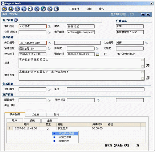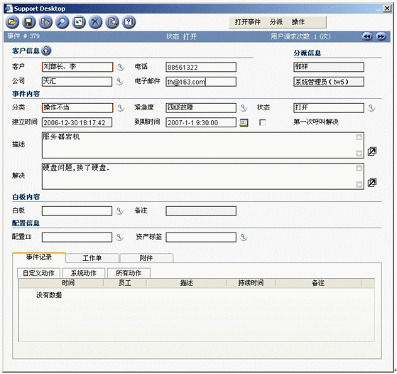 事件記錄應(yīng)該在某個服務(wù)臺工具中記錄和跟蹤,該工具最好是作為集成的服務(wù)管理工具集的構(gòu)成部分。該工具應(yīng)該在引發(fā)新的事件時提供最基本的事件記錄。比如為了幫助提高效率,當你在天匯幫助臺的用于記錄事件的事件窗口中輸入請求發(fā)起者的姓名時,利用客戶數(shù)據(jù)庫可以自動填充諸如位置、部門和聯(lián)系詳細信息等字段。天匯幫助臺還支持使用計算機電話集成