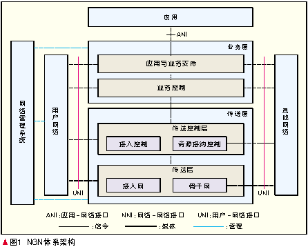 NGN基于IP技術,采用業(yè)務層和傳送層相互分離、應用與業(yè)務控制相互分離、傳送控制與傳送相互分離的思想,能夠支持現(xiàn)有的各種接入技術,提供話音、數(shù)據(jù)、視頻、流媒體等業(yè)務,并且支持現(xiàn)有移動網(wǎng)絡上的各種業(yè)務,實現(xiàn)固定網(wǎng)絡和移動網(wǎng)絡的融合,此外還能夠根據(jù)用戶的需要,保證用戶業(yè)務的服務質量。NGN的網(wǎng)絡體系架構如圖1所示,