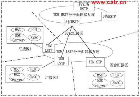 按照混合方式的網(wǎng)絡(luò)組織如下:作為TDM信令網(wǎng)的補充,IP STP和TDM STP共同承擔(dān)省會匯接區(qū)的業(yè)務(wù)。IP
