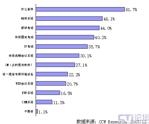 盡管統(tǒng)一通信的概念已經(jīng)被各大廠商廣為宣傳,統(tǒng)一通信的目標(biāo)是實(shí)現(xiàn)各種溝通方式的融合,但是從國內(nèi)的企業(yè)來看,他們對統(tǒng)一通信的認(rèn)識仍然還處于比較模糊的階段,那么從用戶本身來講,他們最需要統(tǒng)一通信能把哪些功能實(shí)現(xiàn)相互融合呢?2007年底,國內(nèi)ICT市場研究咨詢機(jī)構(gòu)計(jì)世資訊(CCW Research)對國內(nèi)的潛在用戶進(jìn)行了一次大樣本調(diào)研,被調(diào)研的企業(yè)數(shù)量超過800家,企業(yè)領(lǐng)域分布在各行各業(yè),重點(diǎn)以大中型企業(yè)為主,調(diào)研結(jié)果表明,目前國內(nèi)企業(yè)用戶希望能實(shí)現(xiàn)互聯(lián)互通功能排在第一位的是辦公套件、占到所有被調(diào)研對象的六成以上,其次是郵件系統(tǒng)和移動電話,占近一半的比例,之后是固話、視頻會議和即時通信,而和用戶業(yè)務(wù)系統(tǒng)的整合,如ERP、CRM則排在最后。