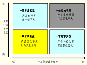 一般來說,產(chǎn)品創(chuàng)新程度越大,取得突破性的成就就越大,但這往往需要消費者改變消費行為和習(xí)慣。消費行為的改變是一個漸進的過程。對于企業(yè)來說,開發(fā)一個對客戶有價值的創(chuàng)新產(chǎn)品,要想獲得成功,必須盡量減少消費者行為的改變。我們以消費行為改變程度和產(chǎn)品創(chuàng)新改變程度兩方面進行組合得到一個矩陣: