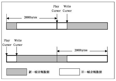 從理論上講,這已經(jīng)保證了音頻回放的流暢性。但在實(shí)現(xiàn)過程中,由于操作的對(duì)象是一幀的音頻數(shù)據(jù),其回放的時(shí)間僅是0.25秒,所以必須考慮的一個(gè)問題是程序的反應(yīng)速度問題。如果忽略由事件觸發(fā)到真正用Lock函數(shù)鎖定緩沖區(qū)的部分以進(jìn)行新數(shù)據(jù)寫入之間的時(shí)間,則這種實(shí)現(xiàn)方法沒有任何問題。除了最開始的兩幀數(shù)據(jù)外,新的一幀數(shù)據(jù)會(huì)緊跟在前一幀數(shù)據(jù)之后,彼此之間沒有重疊部分,也沒有空隙存在,能很好地達(dá)到音頻回放的流暢效果。但事實(shí)上,由事件觸發(fā)到真正用Lock函數(shù)鎖定緩沖區(qū)的部分以進(jìn)行新數(shù)據(jù)的寫入之間還必須經(jīng)過線程監(jiān)聽到事件,分析事件對(duì)應(yīng)的緩沖區(qū),然后再觸發(fā)相應(yīng)的回調(diào)函數(shù)來(lái)進(jìn)行