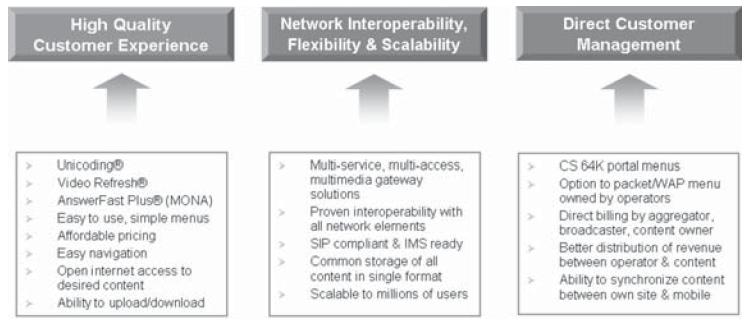 雖然視頻和多媒體服務(wù)的突然火熱對消費者、企業(yè)和業(yè)界來說都是件好事,但存在的挑戰(zhàn)還是很多,如怎樣提供高質(zhì)量的用戶體驗、解決手機和網(wǎng)絡(luò)可互操作性問題,以及集成商、廣播媒體和內(nèi)容提供商的直接用戶接觸與管理問題。這些問題的主要技術(shù)解決方案提供者有Unicoding、Video Refresh和AnswerFast Plus (MONA的一部分),同時多媒體網(wǎng)關(guān)解決方案也包括在內(nèi)。其它方面的可互操作性和用戶體驗改善問題很容易能解決,對今天現(xiàn)有的WAP服務(wù)是一種補充。