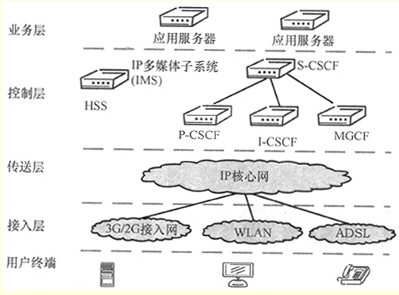 IMS使用會話發(fā)起協(xié)議(SIP)作為建立、控制、修改和終止兩個或者更多個參與者之間的語音、視頻和消息等會話的信令協(xié)議。在IMS中,與SIP相關(guān)的信令點(diǎn)稱為呼叫狀態(tài)控制功能信令點(diǎn),并且根據(jù)它們功能的不同而有所區(qū)分。IMS中與鑒權(quán)、授權(quán)、計(jì)費(fèi)相關(guān)的功能基于IETF、Diameter協(xié)議,是在HSS、CSCF等IMS組件上實(shí)現(xiàn)的,提供業(yè)務(wù)收費(fèi)功能。HSS是與用戶和服務(wù)相關(guān)的數(shù)據(jù)的主要存儲器,由2G移動通信網(wǎng)的HLR演進(jìn)而來。業(yè)務(wù)層上的應(yīng)用服務(wù)器提供各種業(yè)務(wù)邏輯,實(shí)現(xiàn)多種電信增值業(yè)務(wù)。傳送層的IP核心網(wǎng)是IMS業(yè)務(wù)的統(tǒng)一承載網(wǎng)絡(luò)。接入層提供包括2G、3G(UMTS、cdma2000)、WLAN、ADSL等在內(nèi)的多種接入方式。