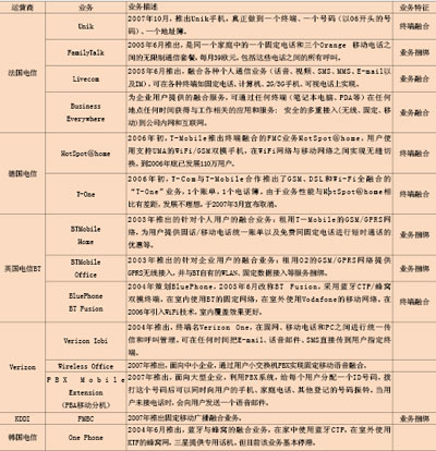 從全球范圍來看,大多數重要的固定運營商、移動運營商和綜合性運營商都已經開始或計劃提供各種形式FMC業(yè)務(見表)。其中大多數運營商提供捆綁業(yè)務和簡單的融合業(yè)務,而歐美的一些頂尖運營商已推出基于融合終端的FMC業(yè)務。