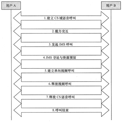 步驟5:建立視頻呼叫。此時(shí)IMS用戶A可向GSM用戶傳送視頻流。不過視頻流不是直接在兩個(gè)用戶間傳送,視頻流首先傳送到VS業(yè)務(wù)網(wǎng)關(guān),由VS業(yè)務(wù)網(wǎng)關(guān)實(shí)時(shí)轉(zhuǎn)發(fā)給GSM用戶B。