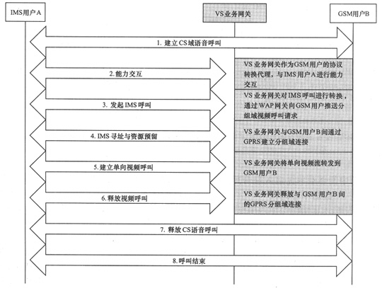 步驟4:IMS尋址與資源預(yù)留。IMS核心網(wǎng)在用戶A和VS業(yè)務(wù)網(wǎng)關(guān)間建立了業(yè)務(wù)路由,同時(shí)預(yù)留了網(wǎng)絡(luò)資源,同時(shí)VS業(yè)務(wù)網(wǎng)關(guān)與GSM用戶B間也建立了GPRS分組域流媒體業(yè)務(wù)連接。