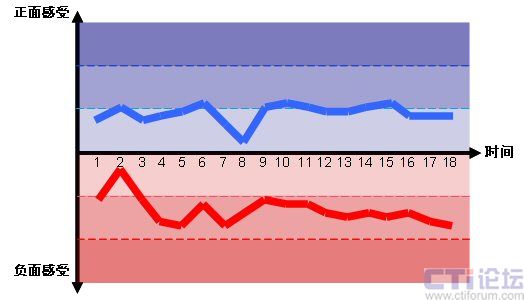 圖2的情感曲線分別是中國移動(dòng)的“喜愛”情感曲線和中國電信的“討厭”情感曲線,對(duì)應(yīng)于雙方整個(gè)呼入電話體驗(yàn)18個(gè)子流程上的情感感受。(注意,我們只列出了中國移動(dòng)的“喜愛”曲線和中國電信的“討厭”曲線來舉例說明。)