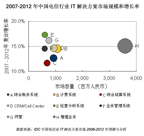 IDC預計,2007-2012年電信行業(yè)將注重運營支撐系統(tǒng)的全業(yè)務運營整合和支持前端業(yè)務,因此3G增值業(yè)務、經營分析系統(tǒng)、客戶關系管理系統(tǒng)、IT服務管理系統(tǒng)等建設將實現快速增長。已有項目仍然會持續(xù)升級維護,以及配合全業(yè)務運營作出功能上的提升。2007年電信IT應用解決方案(僅含解決方案供應商自有軟件及其相關服務包括BSS/OSS/MSS/VAS)市場規(guī)模為97.27億元人民幣,占整體電信軟件和服務市場容量的74.5%。2012年電信行業(yè)IT解決方案整體市場規(guī)模將達到193.5億元人民幣。