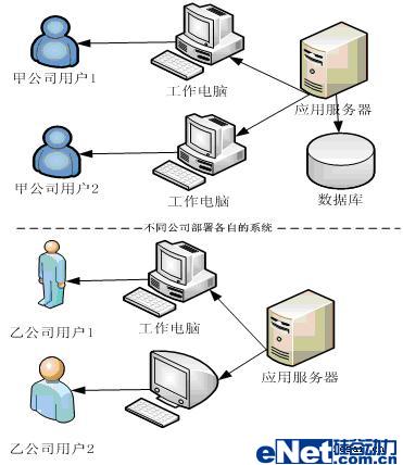 傳統(tǒng)軟件是在公司內(nèi)部架設(shè)軟件運(yùn)行環(huán)境,自己購(gòu)買(mǎi)應(yīng)用服務(wù)器、數(shù)據(jù)庫(kù)服務(wù)器、網(wǎng)卡等硬件,安裝自己的局域網(wǎng)并在局域網(wǎng)內(nèi)部署軟件。所以不同公司都各自部署一套自己的系統(tǒng)。不同公司的用戶事實(shí)是通過(guò)不同的途徑訪問(wèn)不同的系統(tǒng),如圖2所示:
