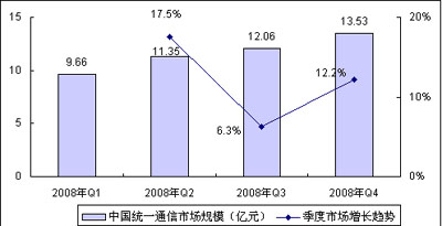 賽迪顧問預測,2008年全年中國統(tǒng)一通信市場都將保持快速的增長勢頭,雖然第三季度增長趨勢有所放緩,全球金融海嘯的反作用將進一步提高企業(yè)對統(tǒng)一通信產(chǎn)品的認知,促進中國統(tǒng)一通信市場的發(fā)展,第四季度市場將出現(xiàn)反彈趨勢,增長速度超過12%,市場規(guī)模13.53億元,2008年全年中國統(tǒng)一通信市場規(guī)模將達到46.6億元,同比增長超過50%。