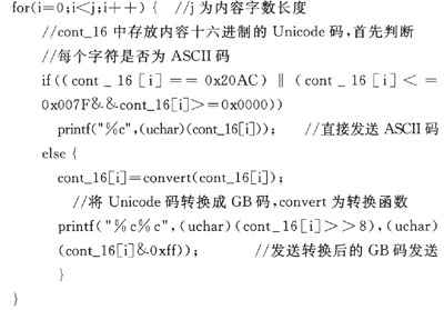 經(jīng)研究比較發(fā)現(xiàn),所要提取的短信信息包括手機(jī)號碼、時間和短信內(nèi)容。在Text模式下時間和日期均為ASCII碼,可直接讀取,只需將內(nèi)容中漢字部分的Unicode碼轉(zhuǎn)換成國標(biāo)碼;而在PDU模式下除漢字編碼轉(zhuǎn)換外,還需將號碼、時間部分編碼進(jìn)行兩兩顛倒的轉(zhuǎn)換,才能得到所需的正確信息。故在系統(tǒng)設(shè)計中將GSM模塊設(shè)為Text模式,更能簡化程序設(shè)計。