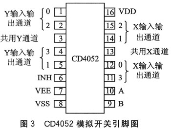51系列單片機(jī)一般只有一個串行通路,通過串口與GSM模塊連接后,則不能再連接其他串口設(shè)備;而一些串口擴(kuò)展芯片成本較高,連接也較麻煩。本方法利用數(shù)控模擬開關(guān)CD4052來做多串口擴(kuò)展器,成本低廉而且接線簡單。其引腳排列如圖3所示。