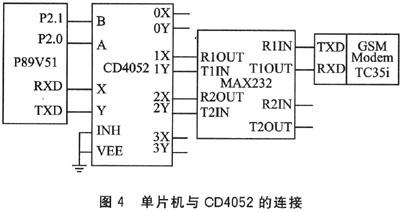 CD4052實際上是2個一分四的數(shù)據(jù)分配器,所擴(kuò)展的串口均是全雙工異步工作模式,具有很高的工作速度,方便地實現(xiàn)了一片單片機(jī)多個串口的擴(kuò)展能力。以Siemens公司的TC35i