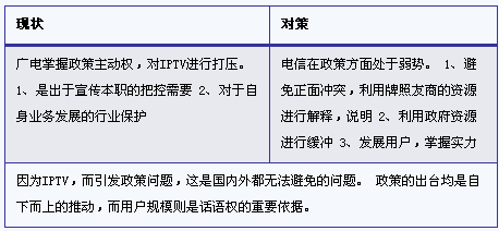 IPTV的發(fā)展,在全球而言,都是一個(gè)涉及到政策和業(yè)務(wù)的發(fā)展難題,在政策上,介于有線和通信之間的IPTV,成為了雙方博弈的利益焦點(diǎn),而在中國這樣的特殊國情下,更是格外突出。