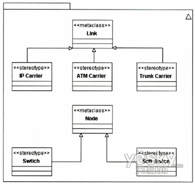 該擴展針對Link和Node和兩個元類增加了NGN中關(guān)于承載和節(jié)點的定型。可以根據(jù)需要對該模型作進一步擴展,如可以增加關(guān)于接入網(wǎng)承載的定型等。