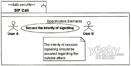 圖3中的UA代表UserA或UserB的UA,因為兩個UA的信令交互需要通過Proxy,且其安全需求是一致的,故在圖中只表現(xiàn)出一方。UA和Proxy均是基于通用計算平臺的節(jié)點,其訪問控制需要受到保護,故對其標(biāo)記上定型《guardedaccess》。UA中除處理信令外,還需處理媒體流的編解碼與控制,這個用例中只涉及信令的安全性,故在UA中只關(guān)注進行信令控制的組件。UA與Proxy之間的通信基于IP承載,根據(jù)表1定義的威脅函數(shù):ThreatA(IP