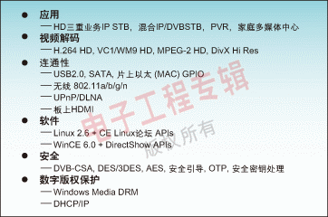 H.264、WM9、AVS的STB810平臺和用于HD H.264 a和VC1的STB225平臺。IP-STB平臺應該提供一個驗證核技術,例如NXP公司基于Nexperia技術的平臺,并且每一個研發(fā)工具都向后兼容。