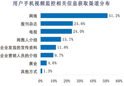 另一方面,運(yùn)營(yíng)商的宣傳不到位。從諾達(dá)咨詢調(diào)查數(shù)據(jù)來看,用戶目前獲得手機(jī)視頻監(jiān)控相關(guān)信息的主要渠道是互聯(lián)網(wǎng),有51%的用戶是通過互聯(lián)網(wǎng)了解手機(jī)視頻監(jiān)控的,而從傳統(tǒng)的電視媒體和報(bào)刊雜志獲得相關(guān)信息的用戶僅僅約各占24%,通過相關(guān)手機(jī)視頻監(jiān)控企業(yè)發(fā)放宣傳資料和介紹獲取相關(guān)信息的用戶各占12%和10%。由此可見,手機(jī)視頻監(jiān)控的宣傳尚不到位,導(dǎo)致消費(fèi)者不能通過多方渠道獲取相關(guān)信息。