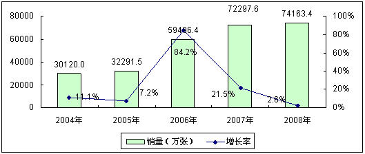 圖2 2004-2008年中國移動通信卡市場規(guī)模與增長(按銷量)