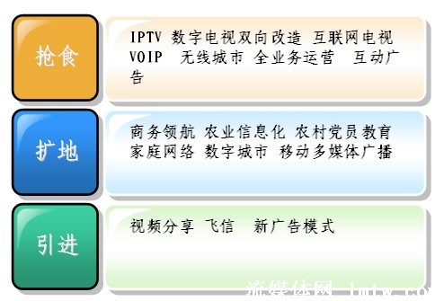 從廣義上講,廣電、電信、互聯(lián)網(wǎng)都屬于信息行業(yè),現(xiàn)在都面臨著自己在增長(zhǎng)中遇到的問題,也就是滯漲。滯漲逼迫大家必須去轉(zhuǎn)型,轉(zhuǎn)型現(xiàn)在有三種方式,一個(gè)是搶,一個(gè)是擴(kuò),一個(gè)是引進(jìn)。從最近會(huì)議上來看,目前大家對(duì)搶食比較感興趣,畢竟有現(xiàn)成的一碗紅燒肉已經(jīng)做好了,對(duì)后面兩個(gè),相對(duì)來說談得還比較少,因?yàn)楹竺鎯蓚(gè),需要引入一些創(chuàng)新的技術(shù),引入創(chuàng)新的思維。