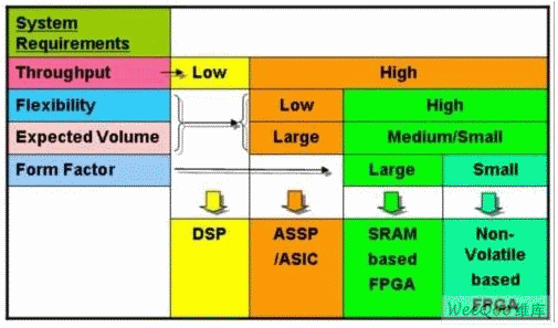 但是ASIC和ASSP帶來(lái)了高昂的非重復(fù)性工程費(fèi)用成本,除非批量非常大。如果只有一小部分用戶(hù)使用特殊的功能模塊,那么FPGA解決方案可提供更好的回報(bào)。對(duì)于ASIC和ASSP,這些器件有限的功能和固有的不靈活性,不允許在設(shè)計(jì)完成后根據(jù)市場(chǎng)的要求改進(jìn)或添加新的功能。FPGA卻能提供廣泛的功能和高度的靈活性。