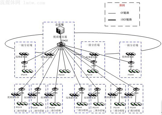 方案二:全集中式。在總前端集中部署若干臺視頻服務器,通過萬兆網(wǎng)絡直接向各分前端提供視頻流服務;示意圖如下: