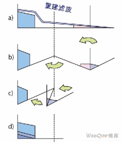 從圖5可以看出重建濾波器的作用,利用參考書(shū)中提供的定理可以很容易理解頻譜混疊。通常,在頻域,頻率和放大倍數(shù)都采用對(duì)數(shù)刻度,重建濾波器的頻響特性表現(xiàn)為平滑曲線。然而,為了說(shuō)明邊帶重疊的位置,我們用線性坐標(biāo)表示頻率和放大倍數(shù)。為了表示低通濾波器在同樣刻度坐標(biāo)下的衰減特性,從濾波器頻響曲線可以看出:對(duì)于有用的視頻信號(hào)衰減很少,對(duì)于鏡像頻率衰減較大。圖5b和5c顯示了混疊效應(yīng),但是應(yīng)該注意到,與圖3d相比,圖5d中的鏡像頻率被顯著衰減。