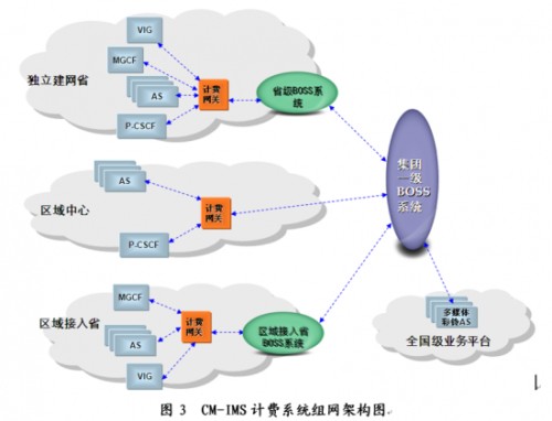 為了降低設備投資風險,CM-IMS在部署初期采用分省和區(qū)域中心相結合的組網方案,并設置全國級業(yè)務平臺。CM-IMS計費系統(tǒng)組網架構如圖3所示。