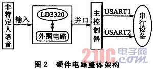 如圖2所示,硬件電路主要包括主控核心部分和語(yǔ)音識(shí)別部分。語(yǔ)音進(jìn)入語(yǔ)音識(shí)別部分后,將處理過(guò)的數(shù)據(jù)并行傳輸?shù)街骺刂破鳎骺刂破鹘?jīng)過(guò)處理后,發(fā)送命令數(shù)據(jù)到USART,USART可用于擴(kuò)展外圍串行設(shè)備,如語(yǔ)音合成模塊等。
