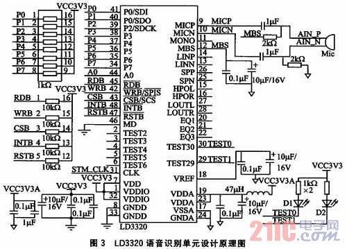 圖3為語(yǔ)音識(shí)別部分原理圖,參照了ICRoute發(fā)布的LD3320數(shù)據(jù)手冊(cè)進(jìn)行設(shè)計(jì)。LD3320的內(nèi)部集成了快速穩(wěn)定的優(yōu)化算法,不需外接Fla-sh、RAM,不需要用戶事先訓(xùn)練和錄音而完成非特定人語(yǔ)音識(shí)別,識(shí)別準(zhǔn)確率高。