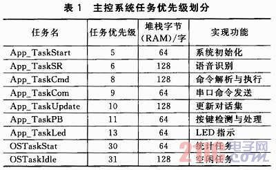 表1中除OSTaskStat和OSTaskIdle任務(wù)為系統(tǒng)自帶,其他7個(gè)任務(wù)均為用戶創(chuàng)建。App_TaskStart是系統(tǒng)的第一個(gè)任務(wù),對(duì)系統(tǒng)時(shí)鐘和底層設(shè)備進(jìn)行初始化,創(chuàng)建所有事件和其他各項(xiàng)用戶任務(wù),并對(duì)系統(tǒng)狀態(tài)進(jìn)行監(jiān)測(cè);App_TaskSR完成語(yǔ)音識(shí)別;App_TaskCmd完成對(duì)話集中命令的解析和執(zhí)行,并通過(guò)USART1向外發(fā)送;App_TaskCom作為外圍擴(kuò)展任務(wù),通過(guò)USART2向外發(fā)送指令或數(shù)據(jù),負(fù)責(zé)控制外圍擴(kuò)展設(shè)備,如語(yǔ)音合成設(shè)備等;