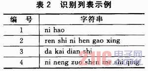 、趯(xiě)入識(shí)別列表。列表的規(guī)則是,每個(gè)識(shí)別條目對(duì)應(yīng)一個(gè)特定的編號(hào)(1個(gè)字節(jié)),編號(hào)可以相同,可以不連續(xù),但是數(shù)值要小于256(00H~FFH)。本芯片最多支持50個(gè)識(shí)別條目,每個(gè)識(shí)別條目是標(biāo)準(zhǔn)普通話的漢語(yǔ)拼音(小寫(xiě)),每2個(gè)字(漢語(yǔ)拼音)之間用一個(gè)空格間隔。本文中采取了連續(xù)不同編號(hào)的識(shí)別條目,表2是簡(jiǎn)單的示例。